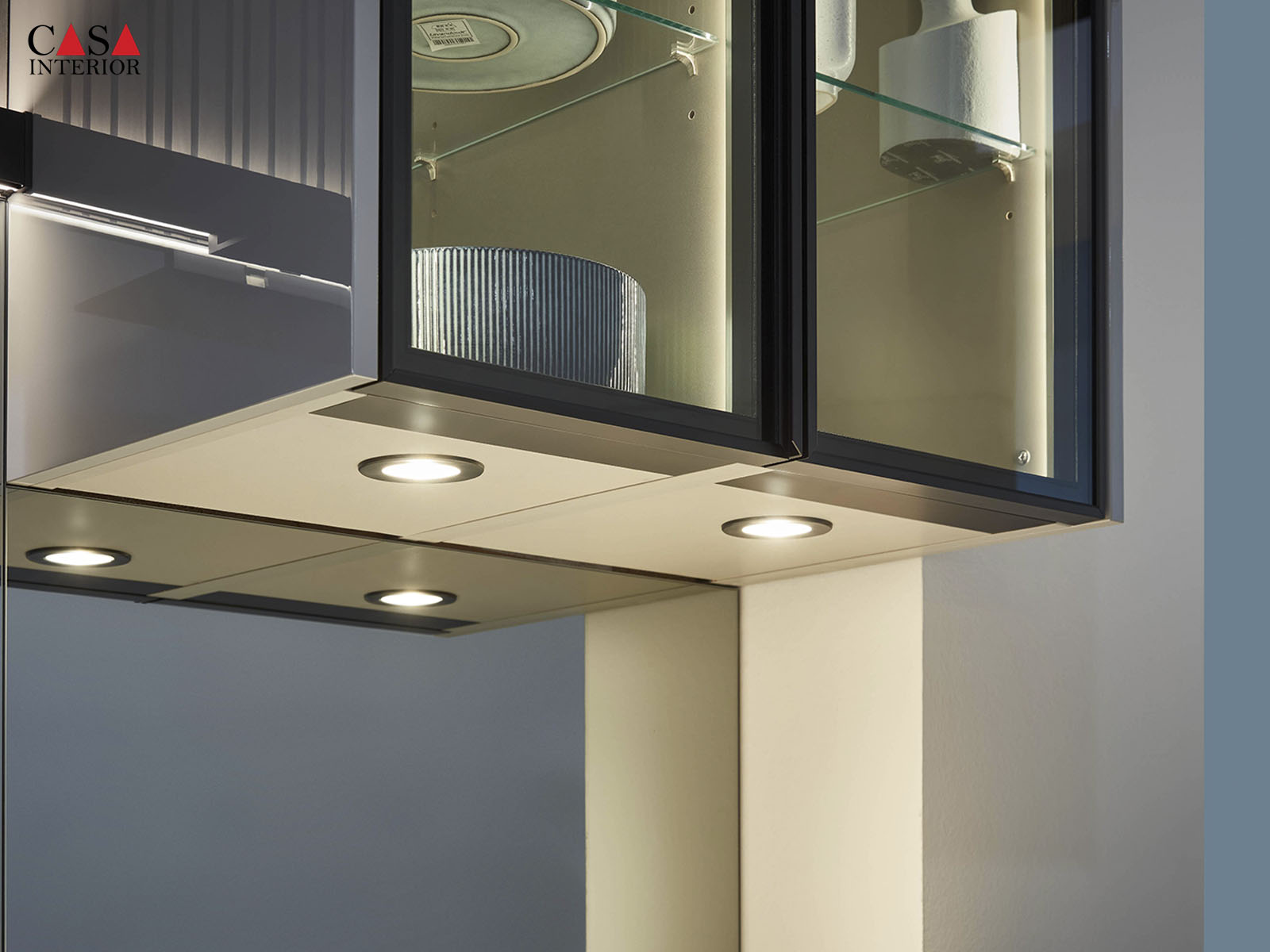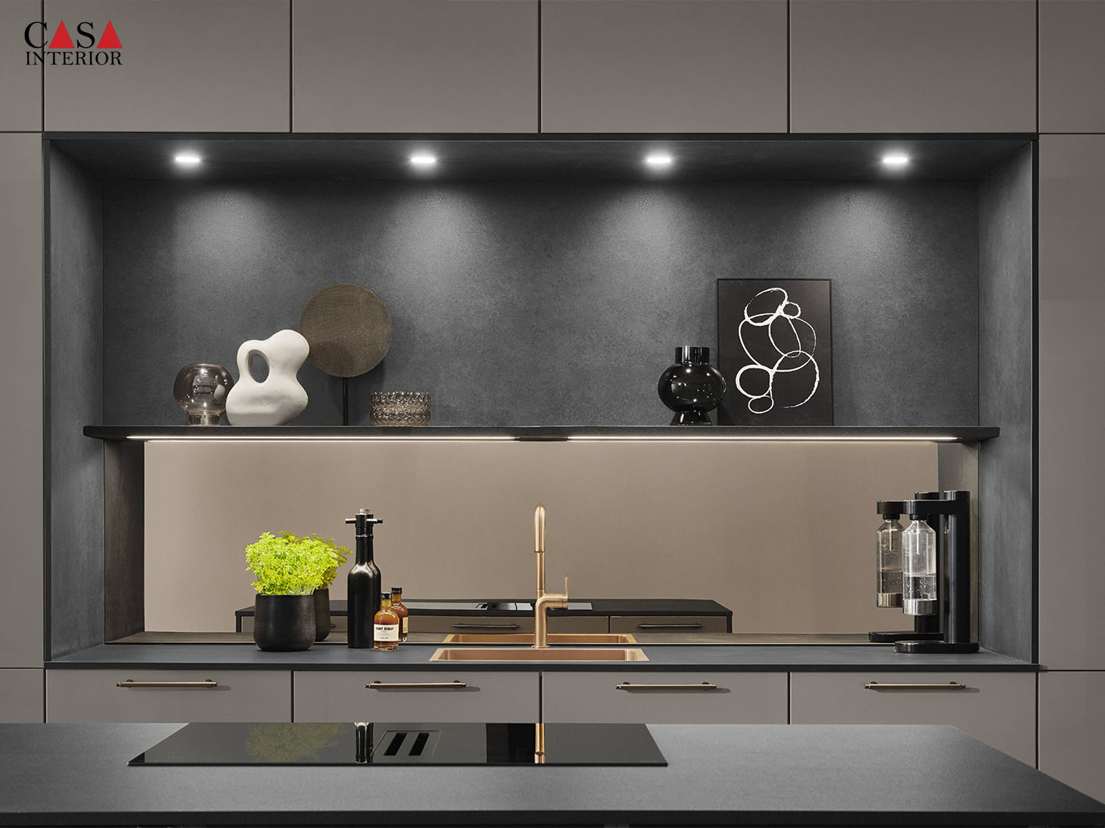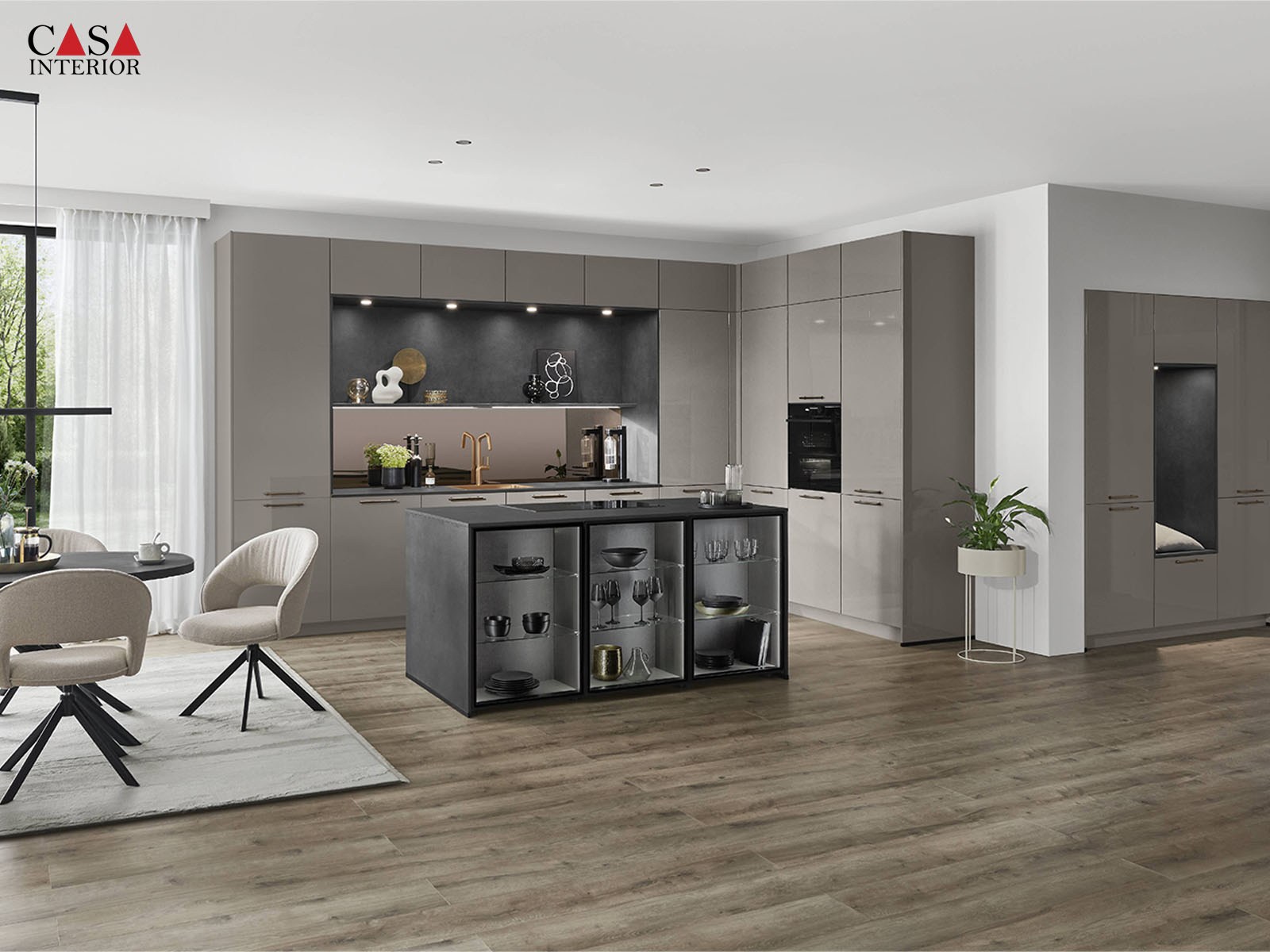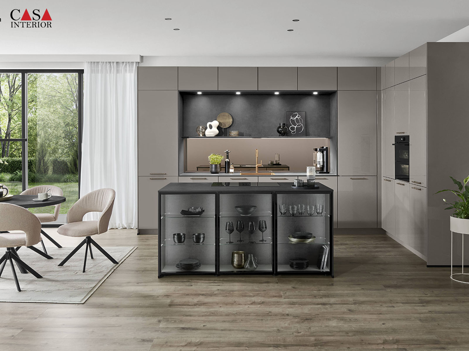 el diseño elegante en el tono natural gris taupé define todo el ambiente y crea una armonía perfecta en todos los espacios. Los frentes lacados en brillo intenso aportan un toque elegante, al combinarlos con detalles en bronce como los tiradores y el fregadero. Materiales oscuros inspirados en la naturaleza, como el diseño granito negro flameado, se integran en diferentes elementos para crear una composición clara y estructurada, con delicados contrastes. Como elemento central del diseño de la isla de cocina, la vitrina Air con puertas de vidrio gris se integra con estilo en el ambiente.
