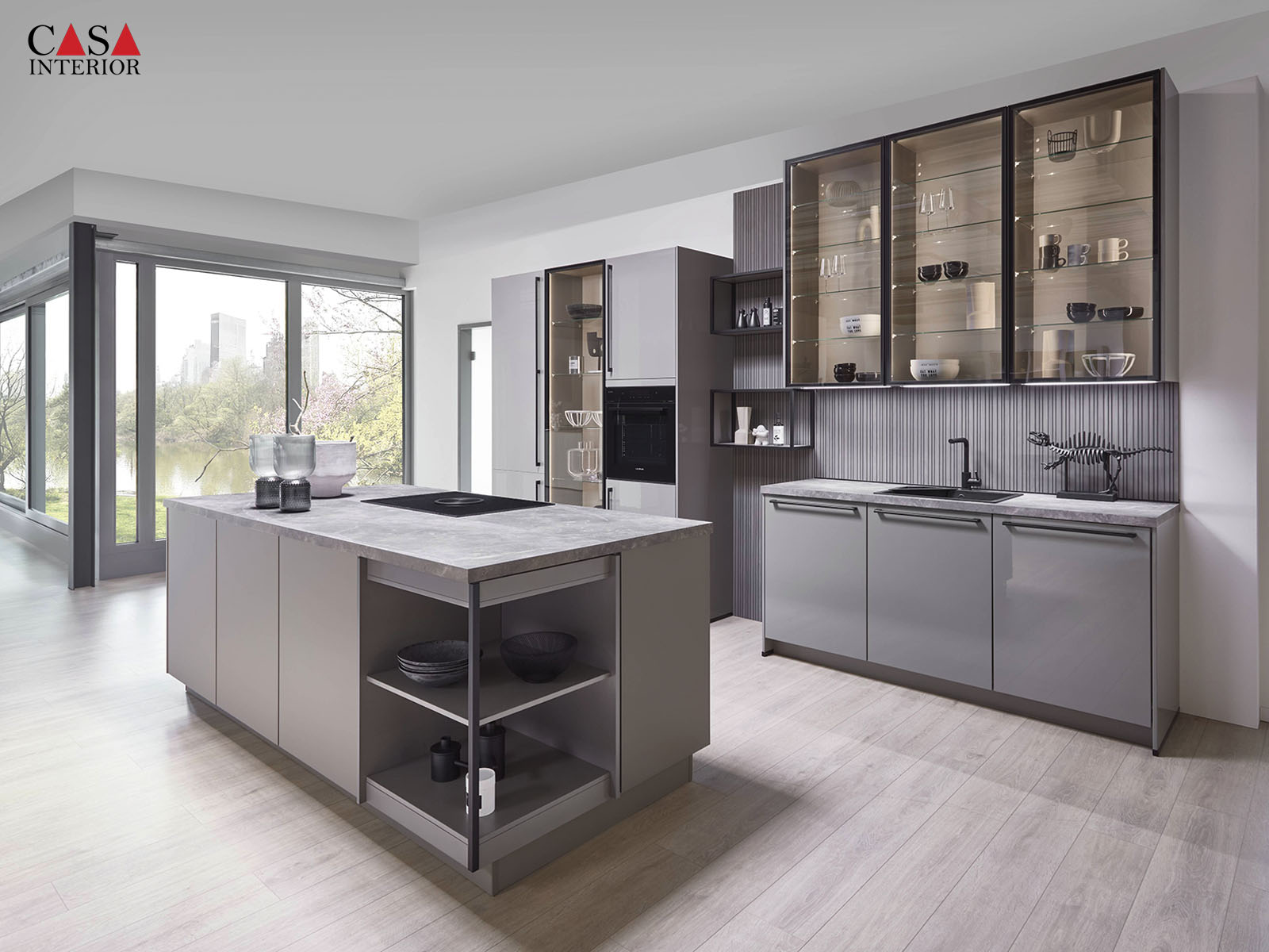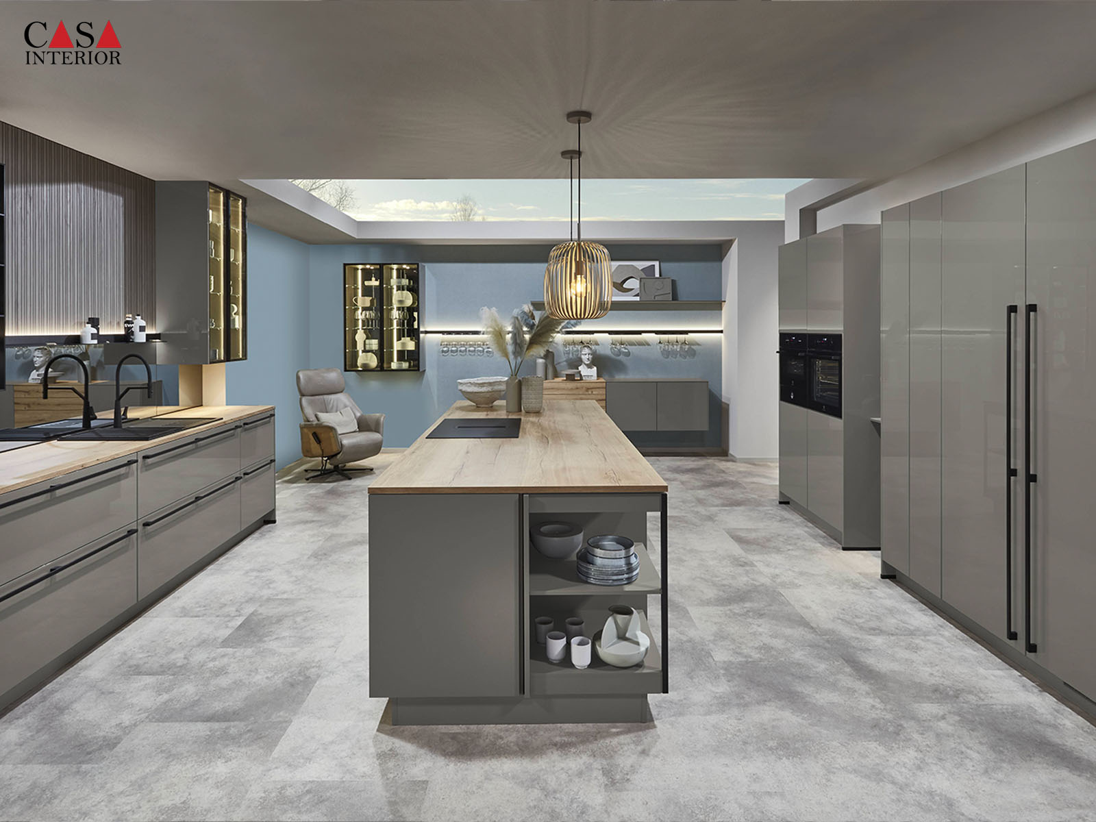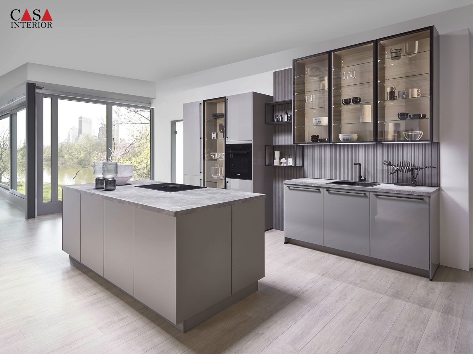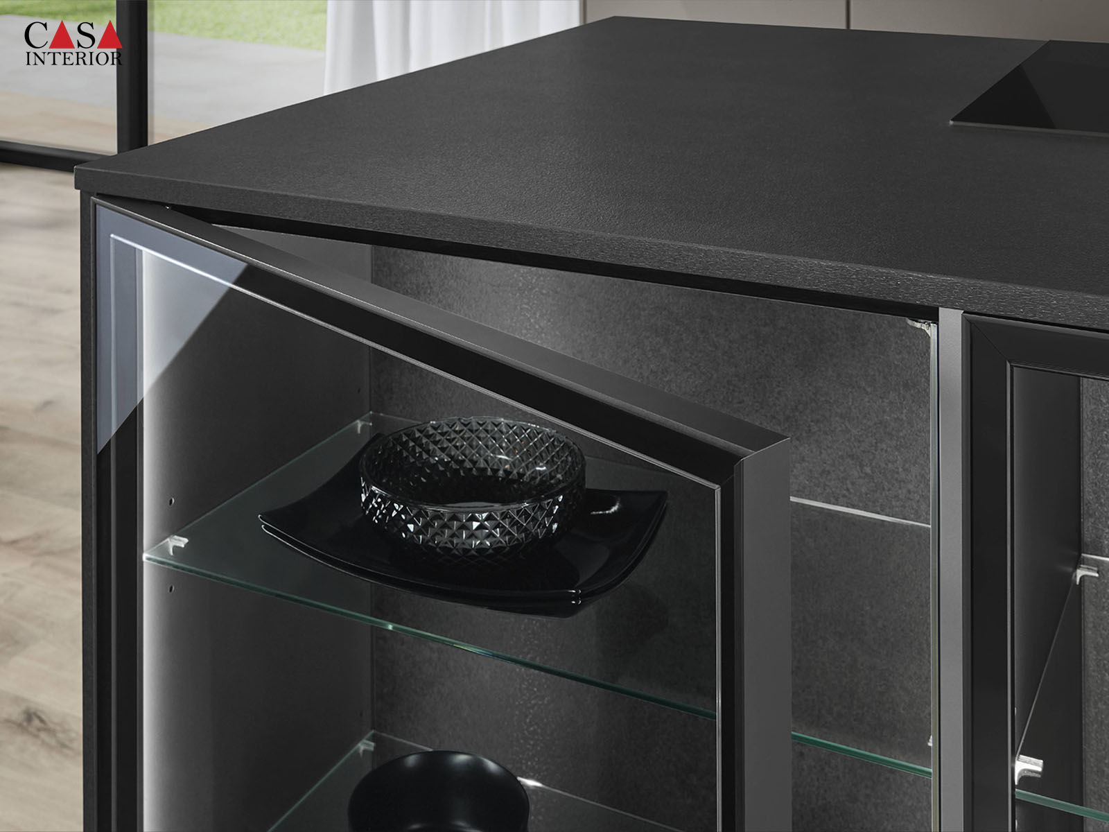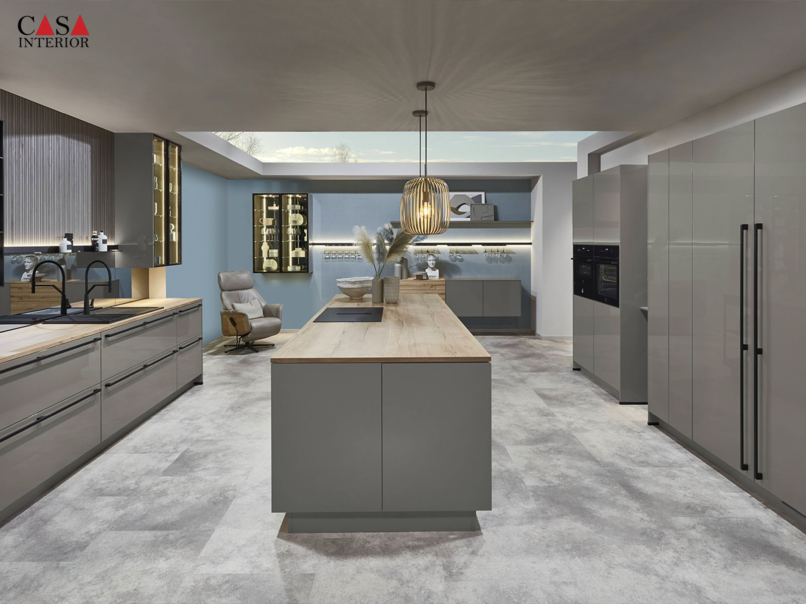 el diseño elegante en el tono natural gris taupé define todo el ambiente y crea una armonía perfecta en todos los espacios. Los frentes lacados en brillo intenso aportan un toque elegante, al combinarlos con detalles en bronce como los tiradores y el fregadero. Materiales oscuros inspirados en la naturaleza, como el diseño granito negro flameado, se integran en diferentes elementos para crear una composición clara y estructurada, con delicados contrastes. Como elemento central del diseño de la isla de cocina, la vitrina Air con puertas de vidrio gris se integra con estilo en el ambiente.