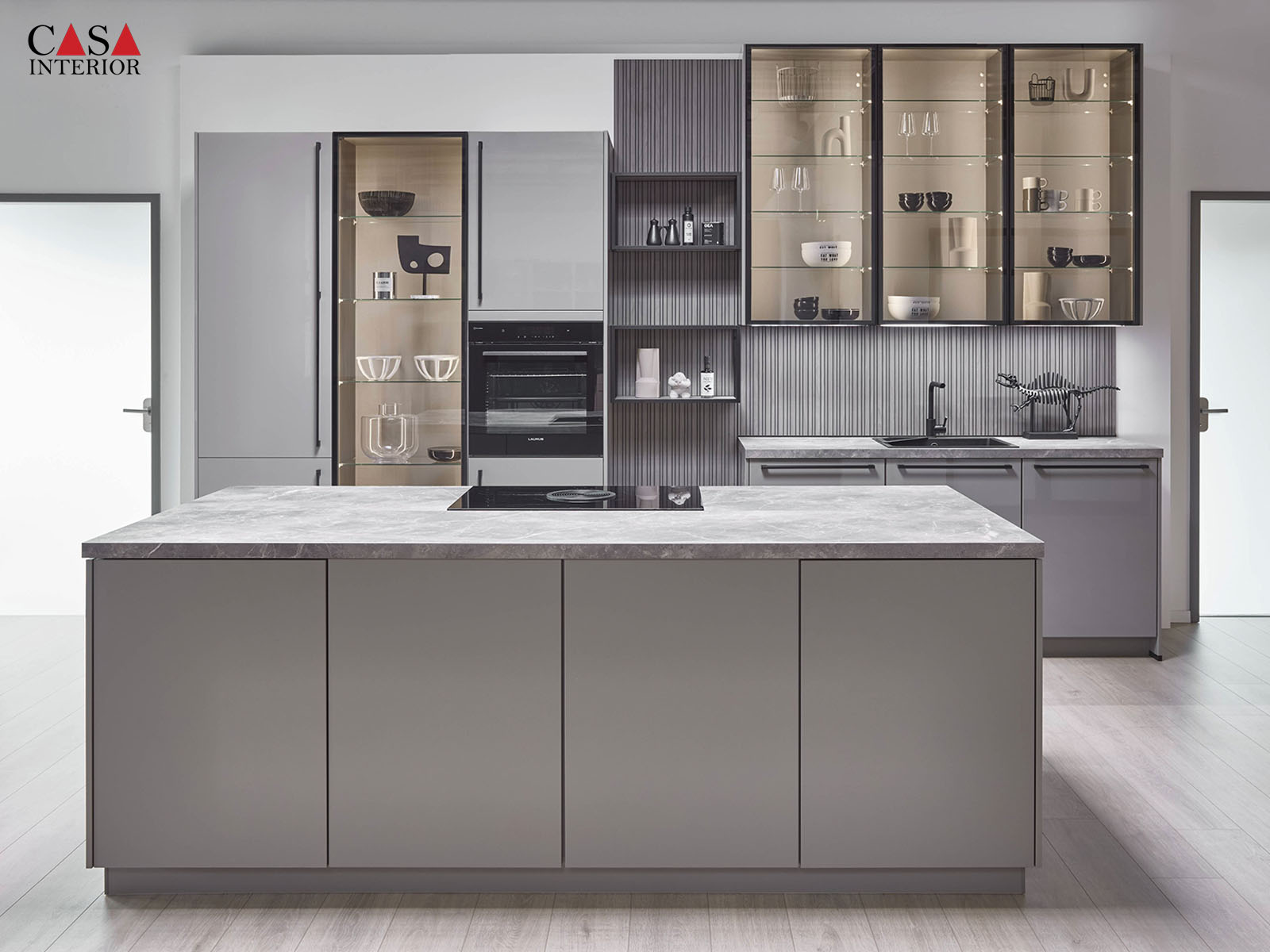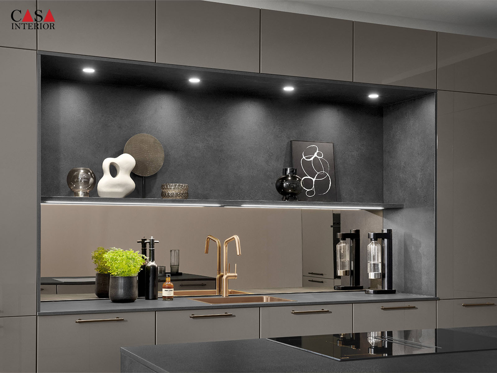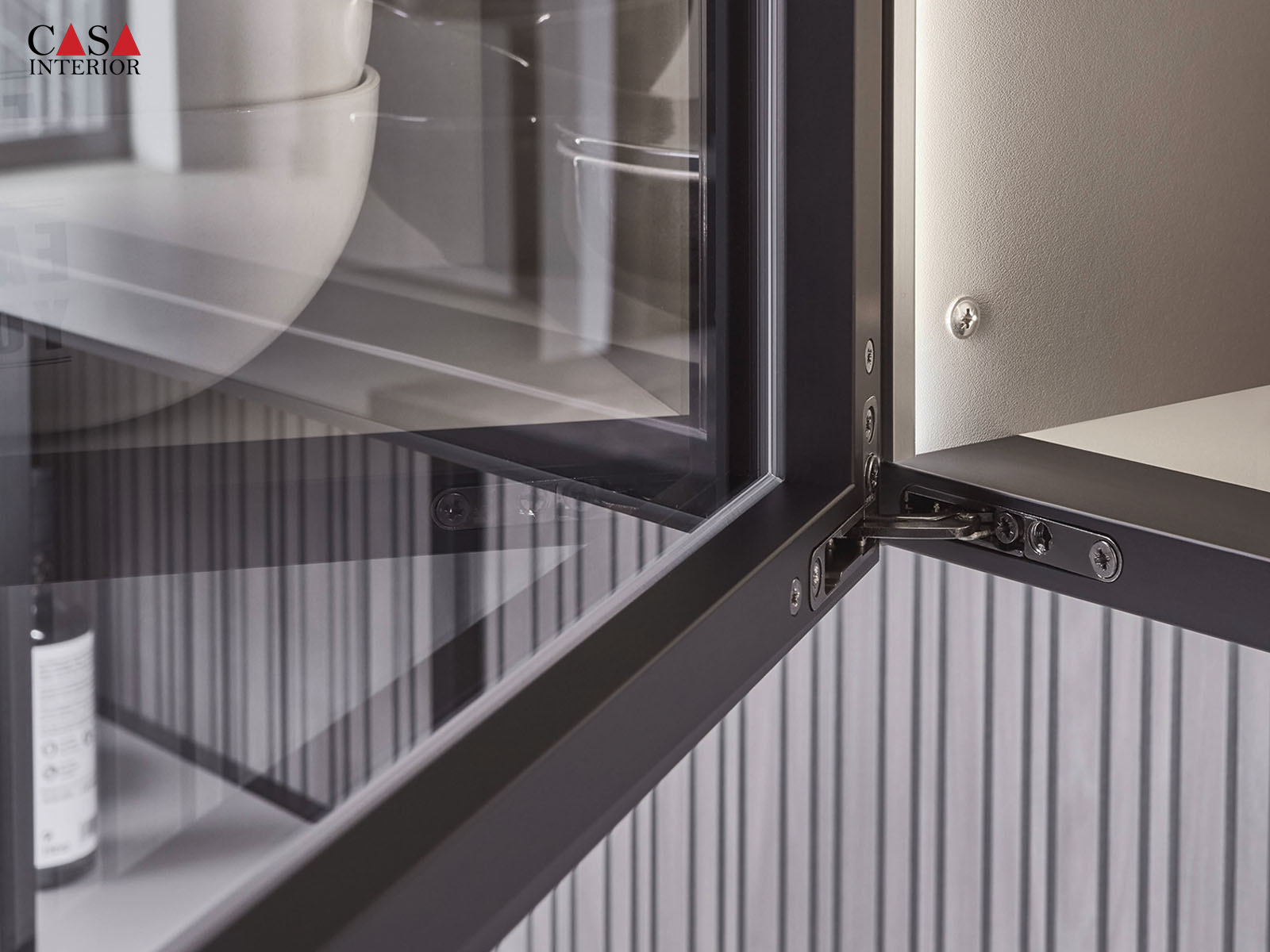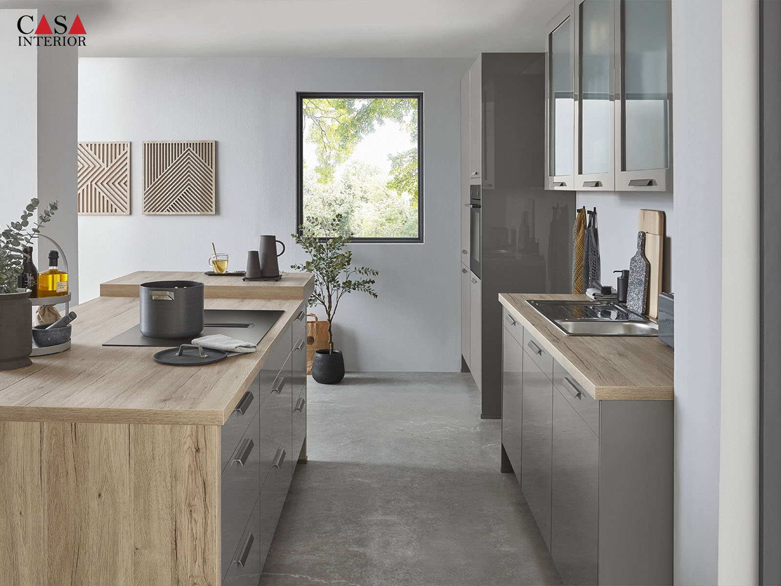 el diseño elegante en el tono natural gris taupé define todo el ambiente y crea una armonía perfecta en todos los espacios. Los frentes lacados en brillo intenso aportan un toque elegante, al combinarlos con detalles en bronce como los tiradores y el fregadero. Materiales oscuros inspirados en la naturaleza, como el diseño granito negro flameado, se integran en diferentes elementos para crear una composición clara y estructurada, con delicados contrastes. Como elemento central del diseño de la isla de cocina, la vitrina Air con puertas de vidrio gris se integra con estilo en el ambiente.