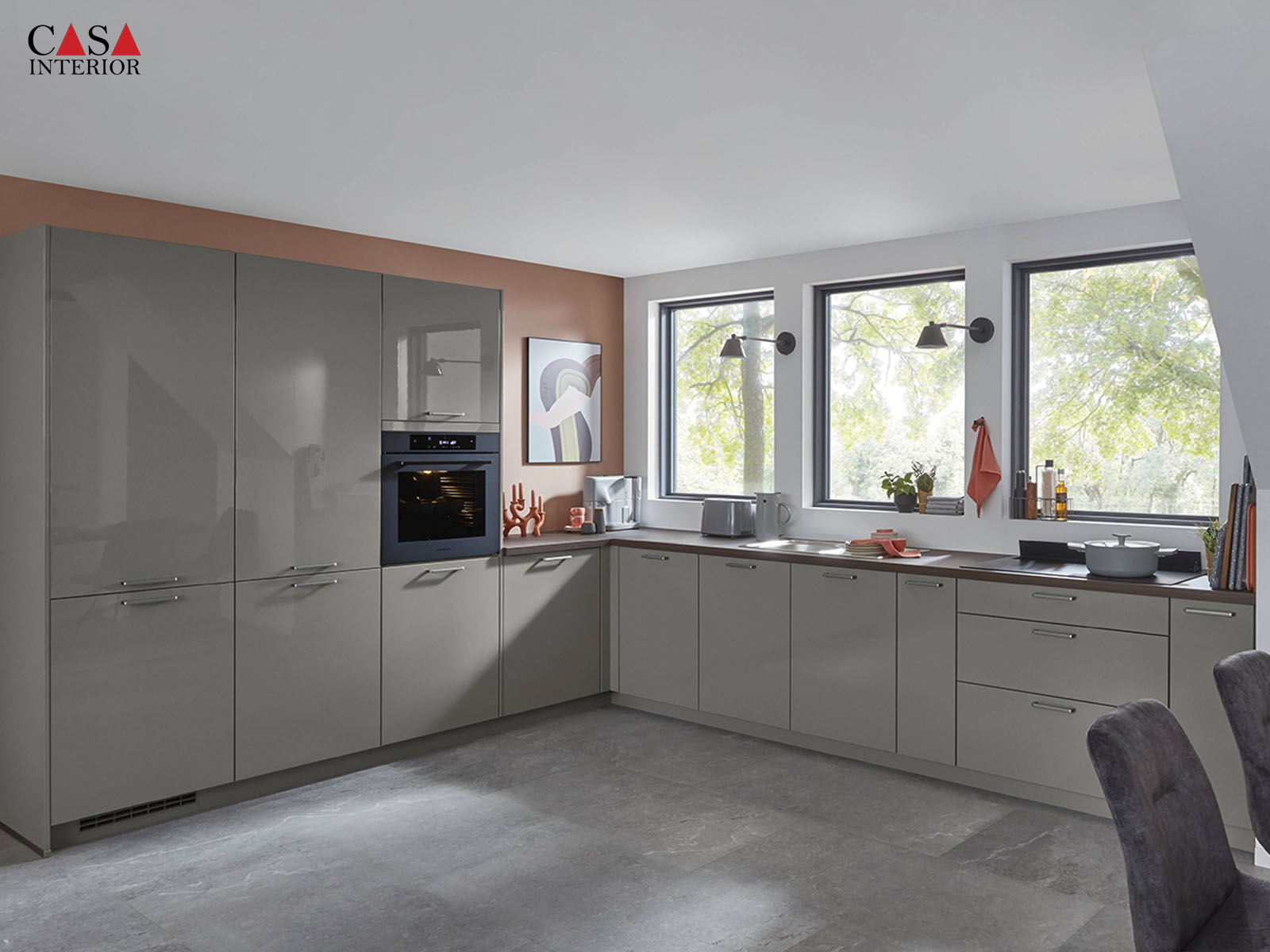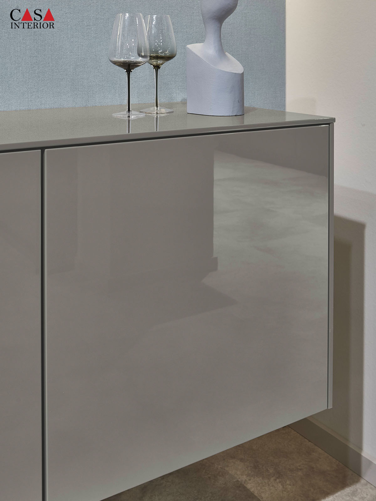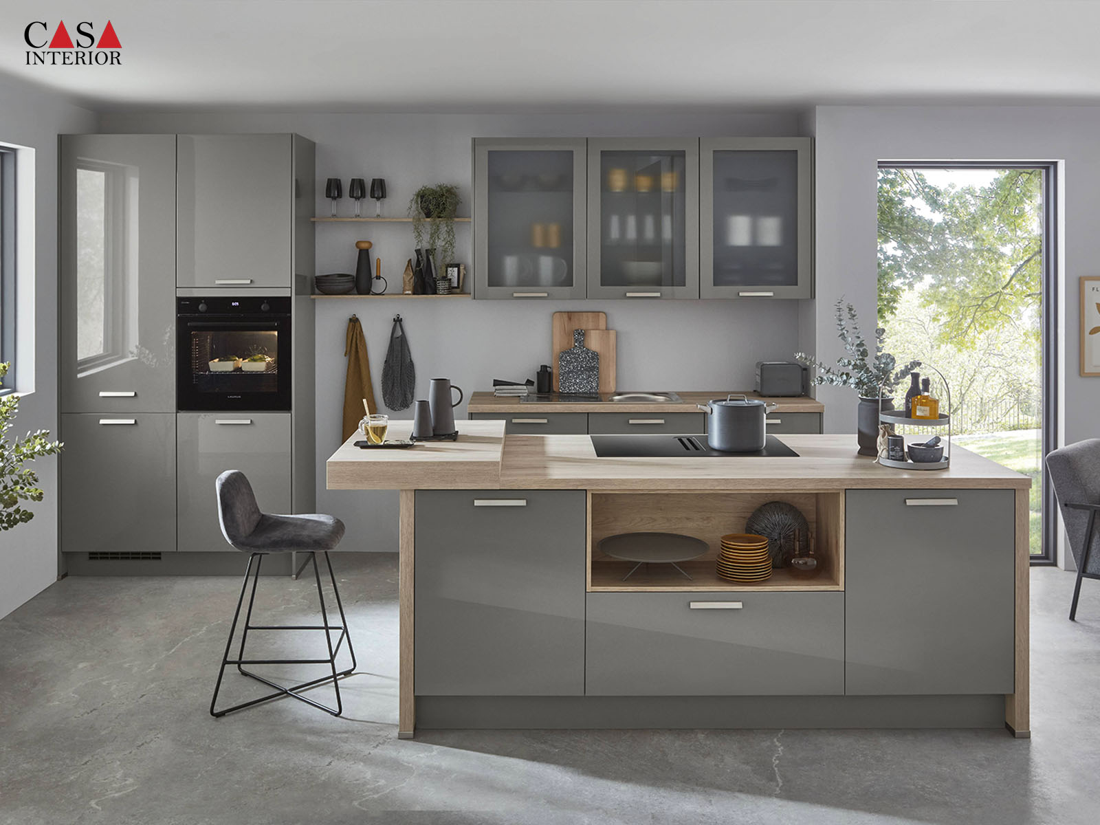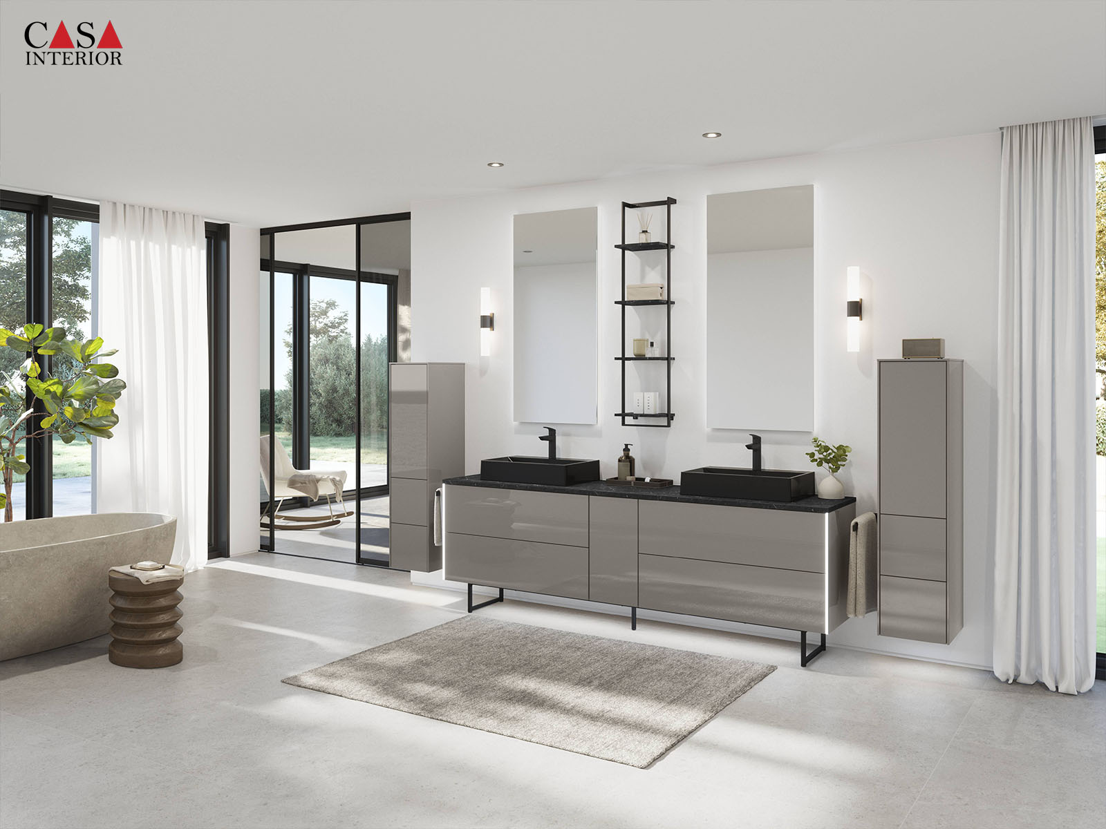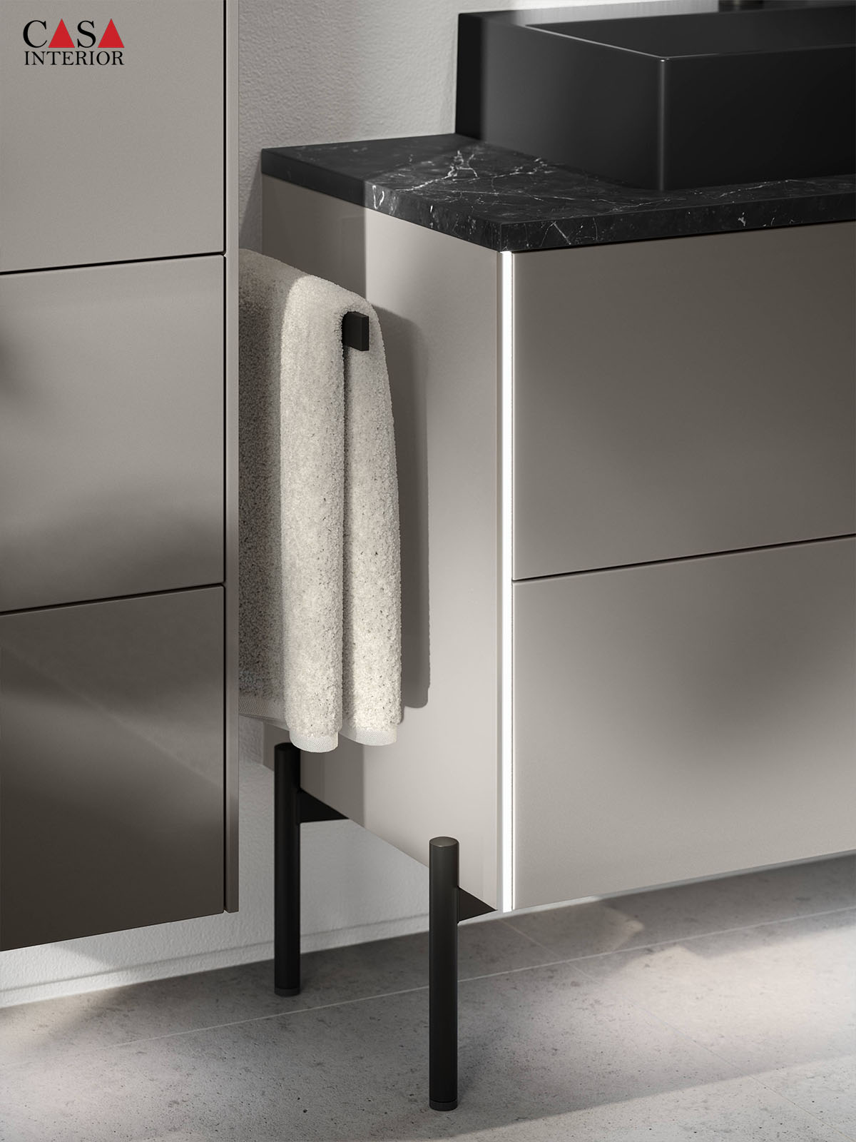 el diseño elegante en el tono natural gris taupé define todo el ambiente y crea una armonía perfecta en todos los espacios. Los frentes lacados en brillo intenso aportan un toque elegante, al combinarlos con detalles en bronce como los tiradores y el fregadero. Materiales oscuros inspirados en la naturaleza, como el diseño granito negro flameado, se integran en diferentes elementos para crear una composición clara y estructurada, con delicados contrastes. Como elemento central del diseño de la isla de cocina, la vitrina Air con puertas de vidrio gris se integra con estilo en el ambiente.