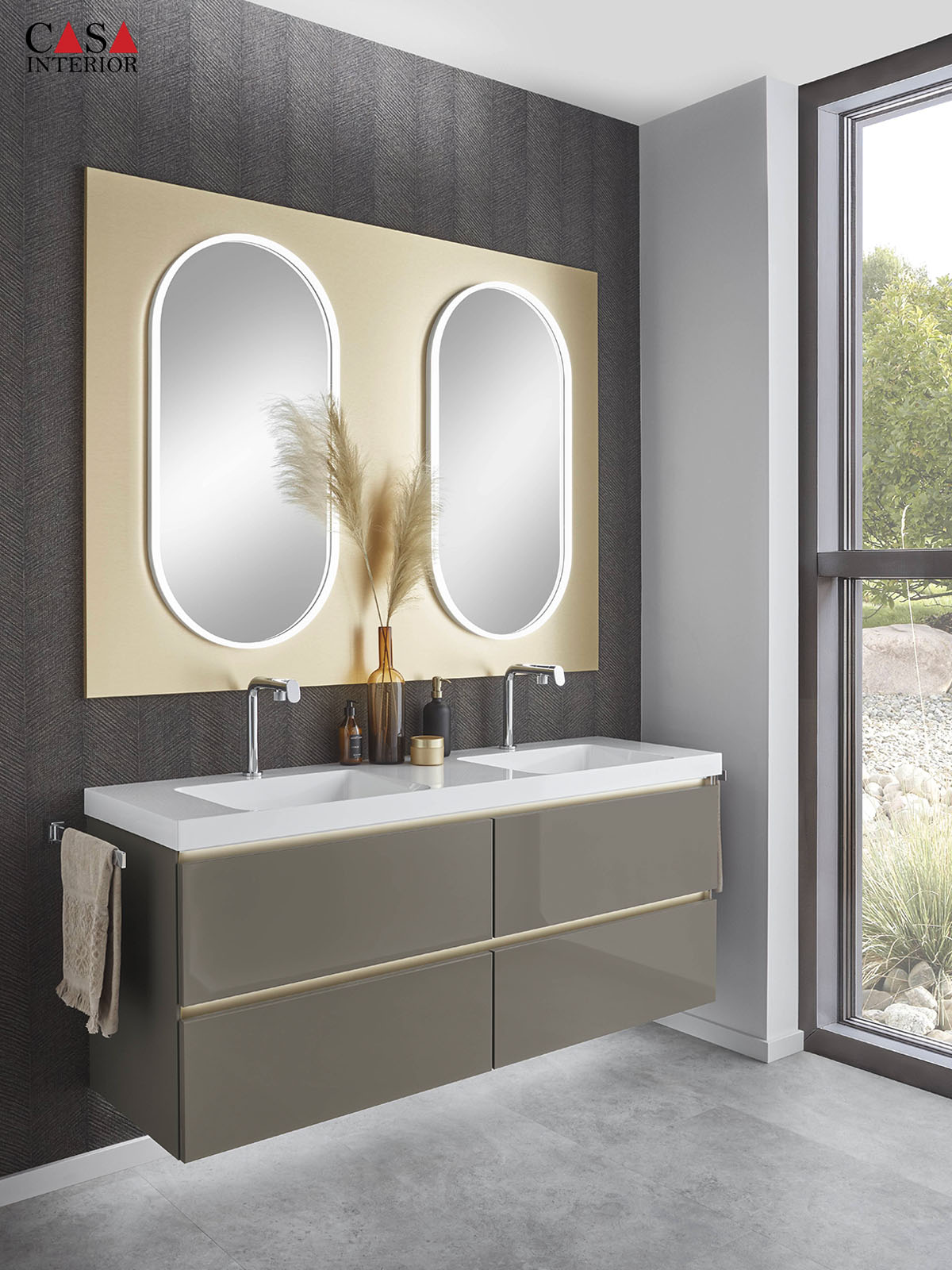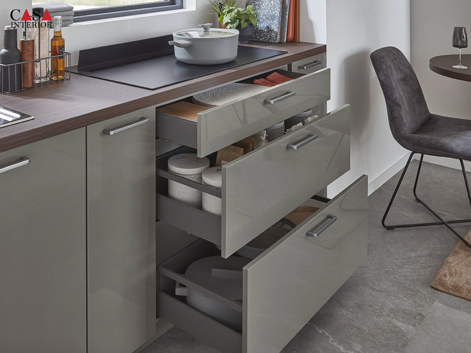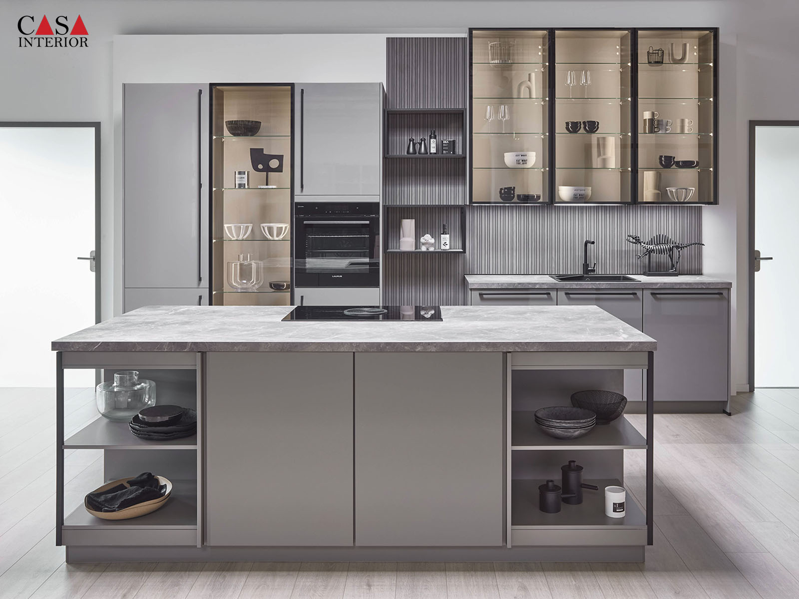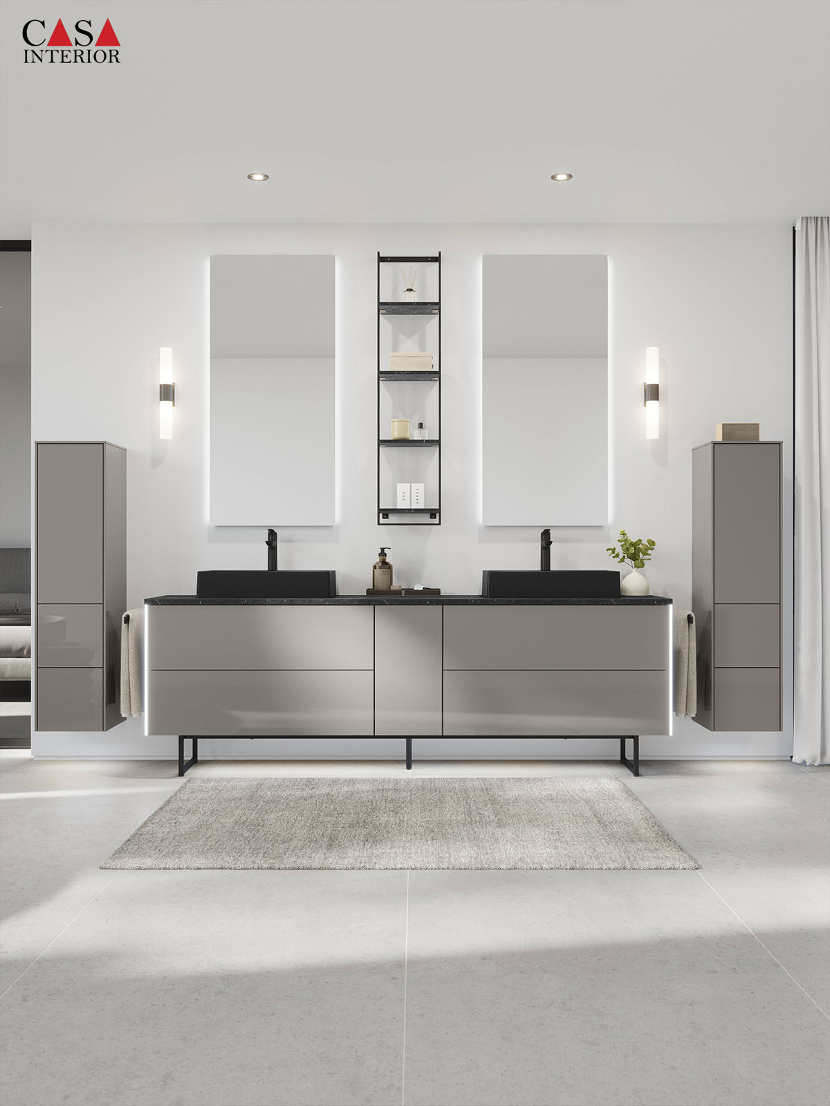 el diseño elegante en el tono natural gris taupé define todo el ambiente y crea una armonía perfecta en todos los espacios. Los frentes lacados en brillo intenso aportan un toque elegante, al combinarlos con detalles en bronce como los tiradores y el fregadero. Materiales oscuros inspirados en la naturaleza, como el diseño granito negro flameado, se integran en diferentes elementos para crear una composición clara y estructurada, con delicados contrastes. Como elemento central del diseño de la isla de cocina, la vitrina Air con puertas de vidrio gris se integra con estilo en el ambiente.