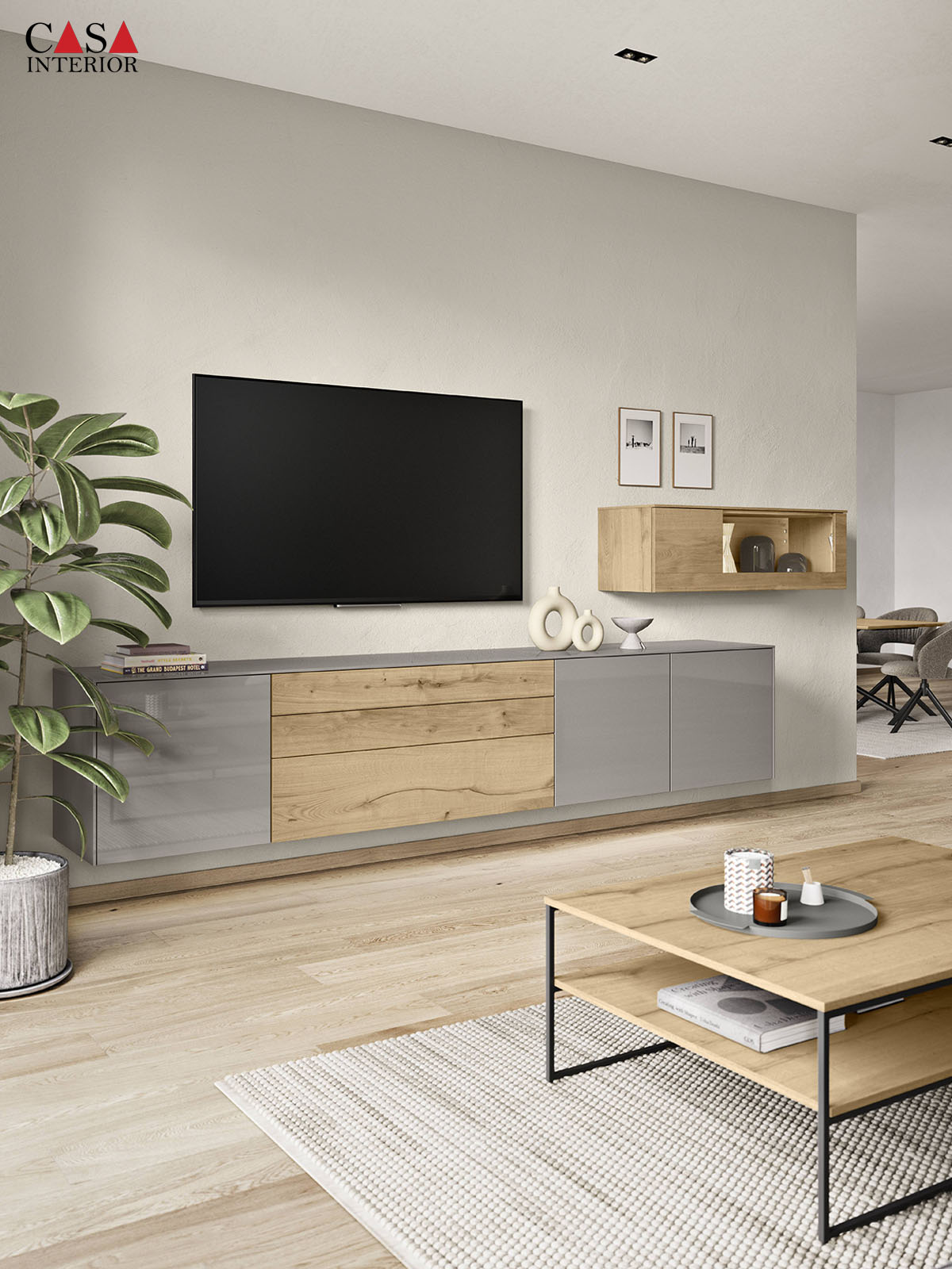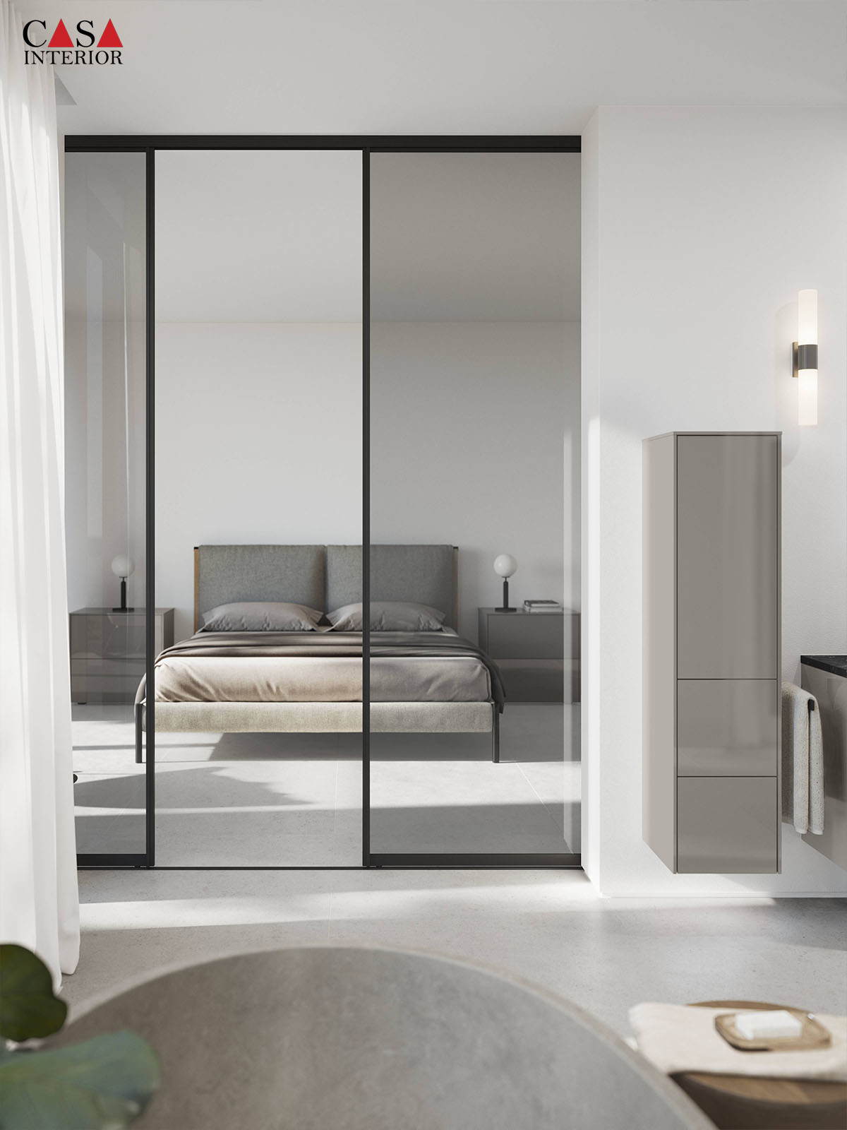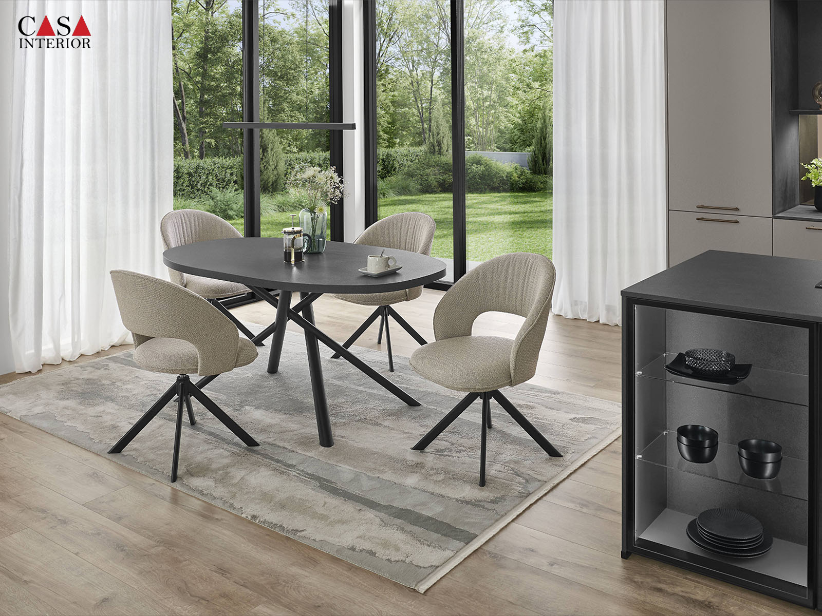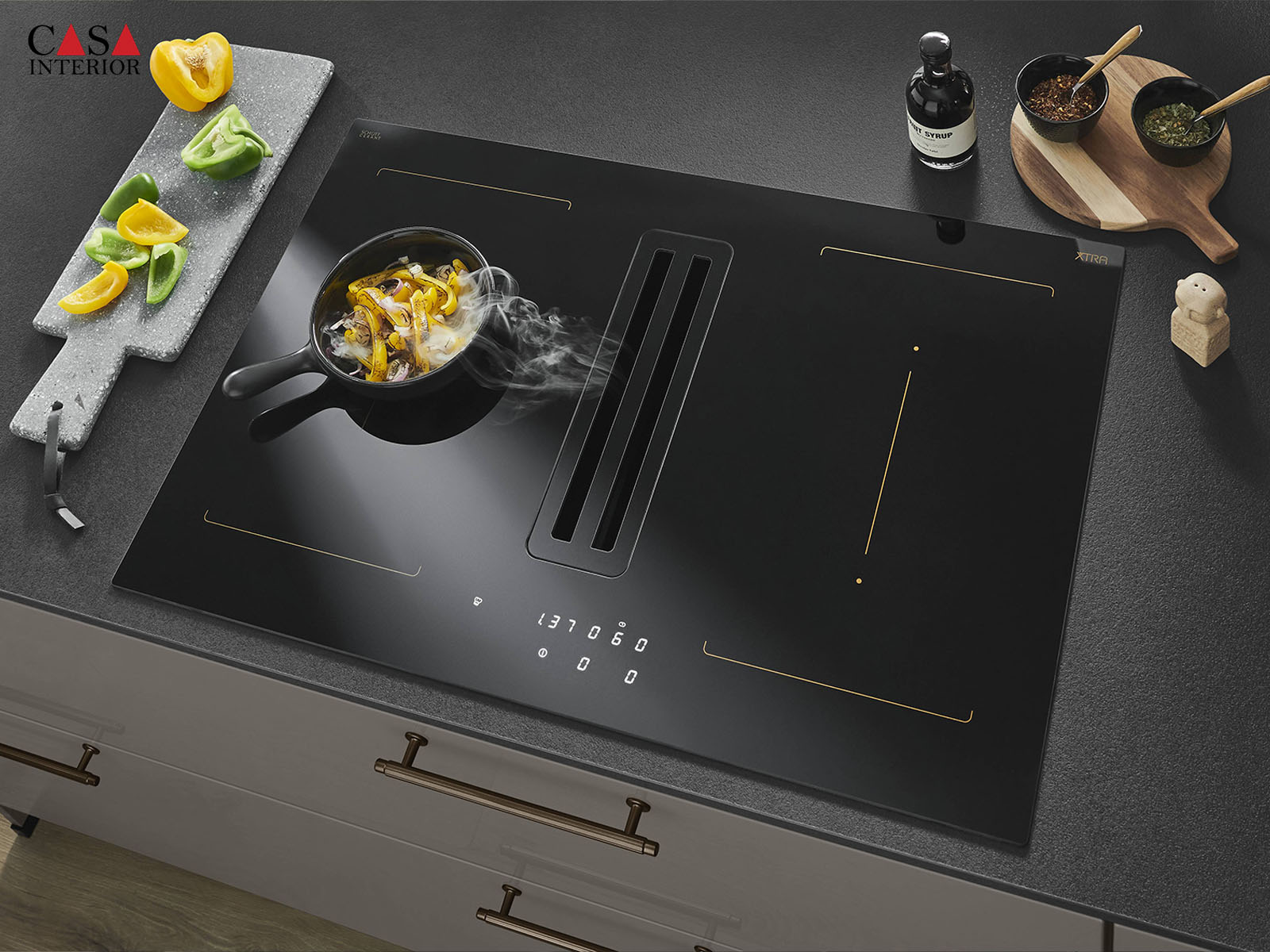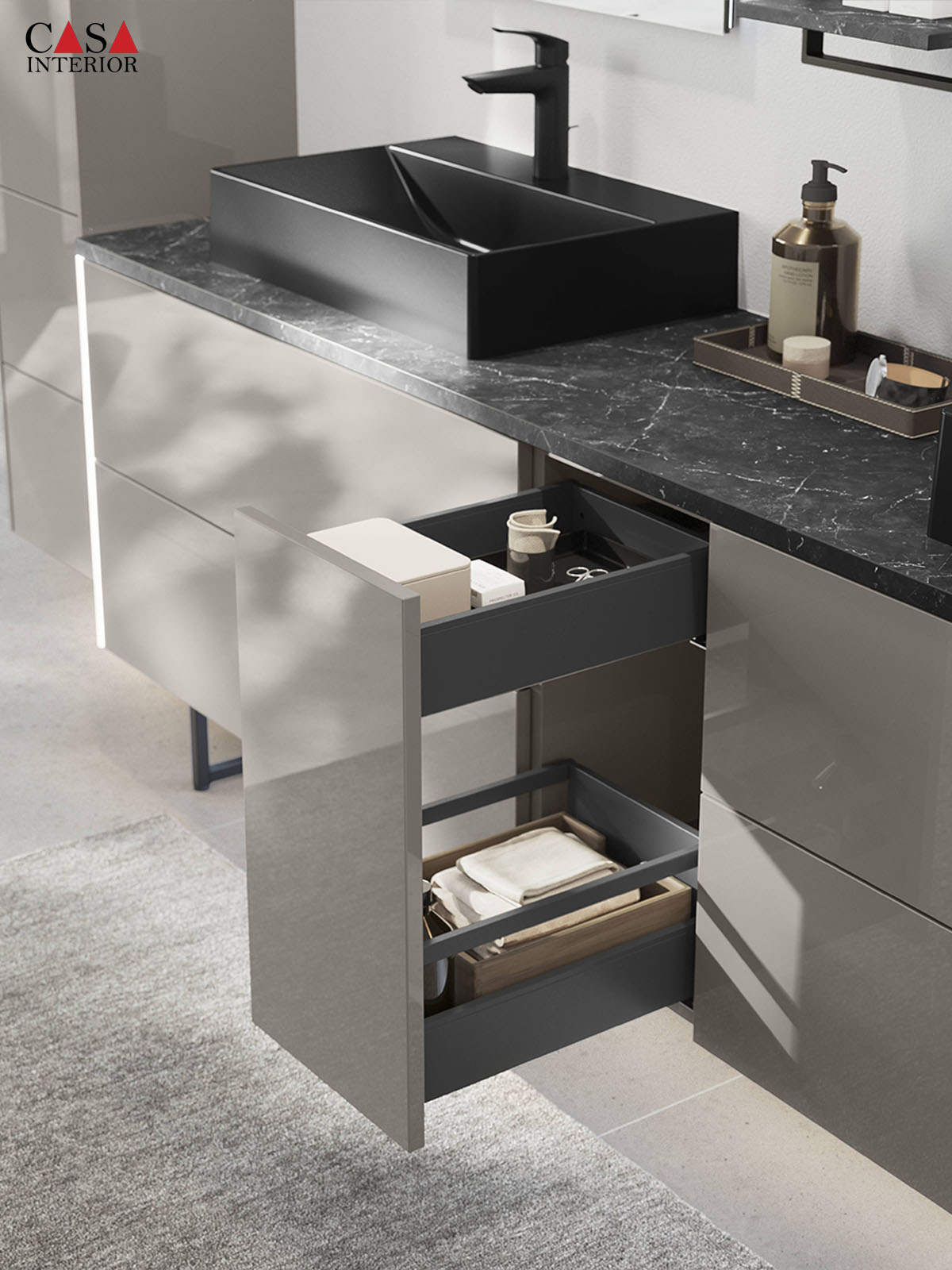 el diseño elegante en el tono natural gris taupé define todo el ambiente y crea una armonía perfecta en todos los espacios. Los frentes lacados en brillo intenso aportan un toque elegante, al combinarlos con detalles en bronce como los tiradores y el fregadero. Materiales oscuros inspirados en la naturaleza, como el diseño granito negro flameado, se integran en diferentes elementos para crear una composición clara y estructurada, con delicados contrastes. Como elemento central del diseño de la isla de cocina, la vitrina Air con puertas de vidrio gris se integra con estilo en el ambiente.